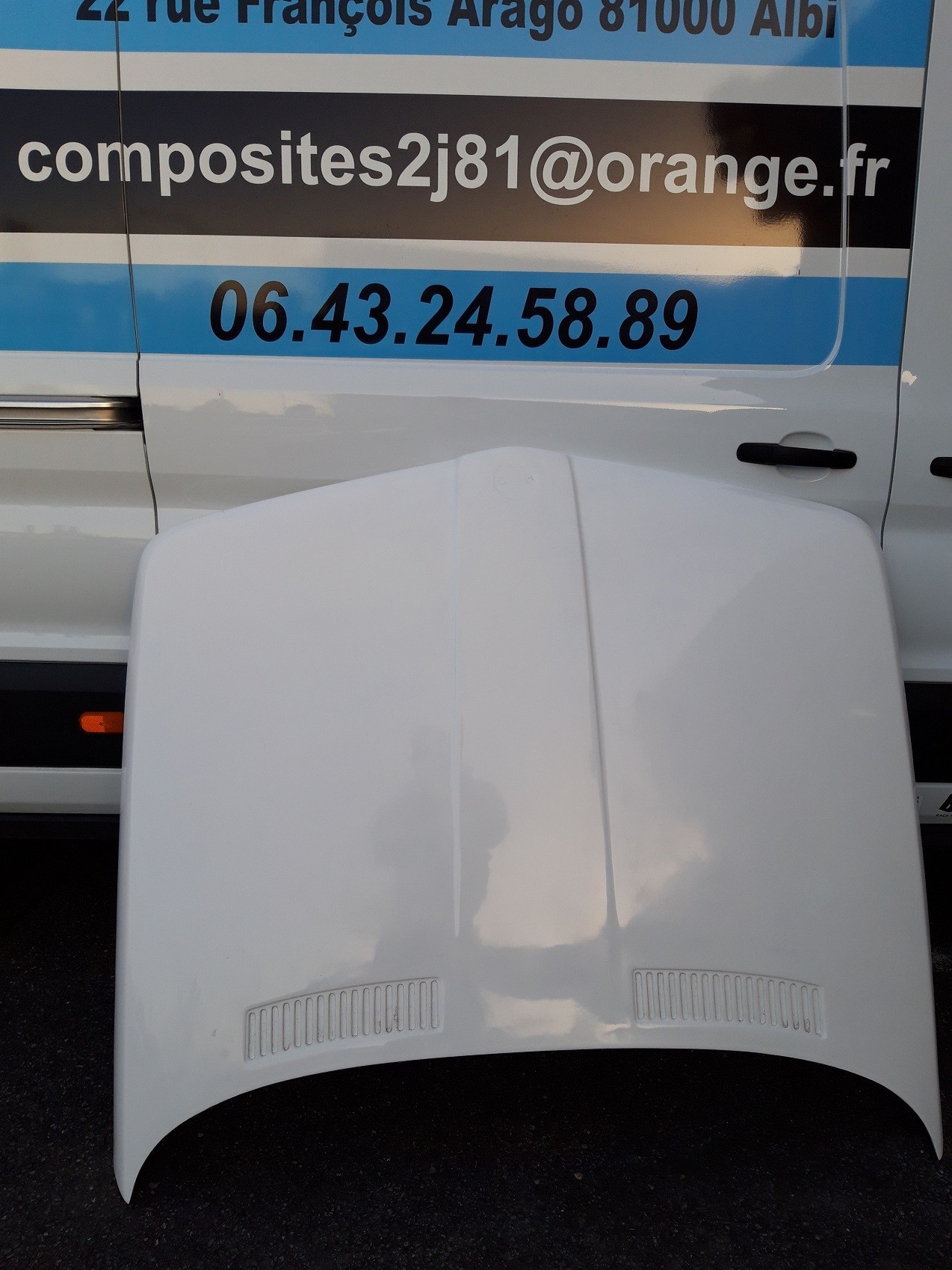 Capot fibre BMW E21, poids moyen C2J 6kg, livré sans perçage sur grille, perçage possible pour 50€ supplémentaires.